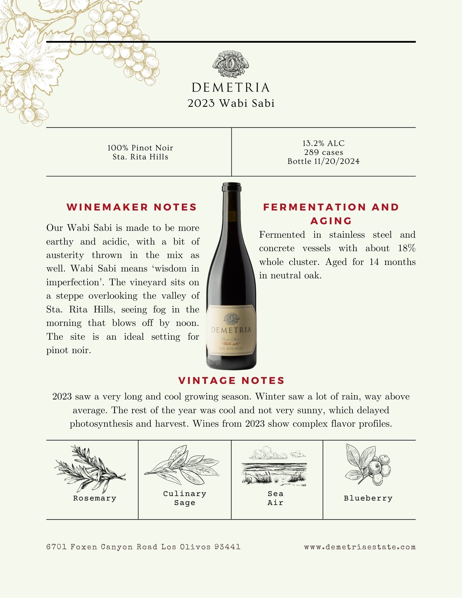 Our Wabi Sabi is made to be more earthy and acidic, with a bit of austerity thrown in the mix as well. Wabi Sabi means ‘wisdom in imperfection’. The vineyard sits on a steppe overlooking the valley of Sta. Rita Hills, seeing fog in the morning that blows off by noon. The site is an ideal setting for pinot noir.