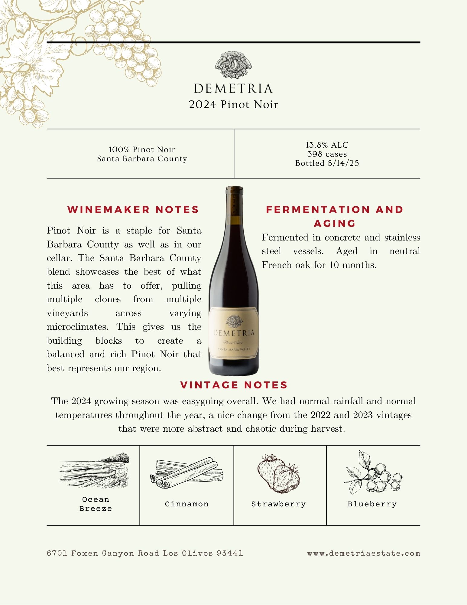 Pinot Noir is a staple in Santa Barbara County, as well as in our cellar. The Santa Barbara County blend showcases the best of what this area has to offer, pulling multiple clones from multiple vineyards across varying microclimates. This gives us the building blocks to create a balanced and rich Pinot Noir that represents our region.